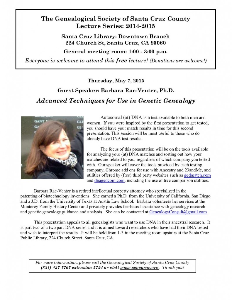 Advanced Techniques for Use in Genetic Genealogy October 31, 2014 By Dave Calendar When: May 7, 2015 @ 1:00 pm – 3:00 pm America/Los Angeles Timezone 2015-05-07T13:00:00-07:00 2015-05-07T15:00:00-07:00 Where: Santa Cruz Library: Downtown Branch 224 Church Street Santa Cruz, CA 95060 USA Contact: Genealogical Society of Santa Cruz County (831) 427-7707 extension 5794